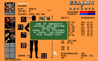 Most dungeon crawls will leave the party in rather poor state. Some members may and will be wounded, poisoned, sick or even dead, and (most) weapons are not indestructible, either. While some of these problems can be solved on the road, and the regeneration of hit points and astral points takes place while sleeping, a hero cannot apply any treatment to him/herself, and also needs to rest after a certain amount of healing attempts, so in bad cases it might be necessary to visit a professional healer. Even those can’t help deceased characters, though, and the only means of resurrection is constant offering and praying at a temple of Tsa, which are very rare in the region. Theoretically, it’s also possible to recruit replacements for dead or lost characters, but this can only be done at the starting temple in Thorwal. Broken weapons have to be taken to a smith, and their repair can take multiple days.
