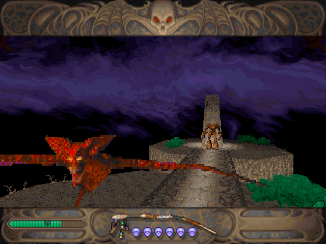 The later areas of the game tend to lack this, though, and come across looking rather barren. But this isn’t so bad in the face of the sometimes quirky, sometimes fantastical, sometimes truly outrageous level design. This is where Realms of the Haunting hits its stride, despite the lack of detail further into it – Gremlin were obviously well aware that their engine wasn’t that realistic, so they compromised by making the player run through a myriad of outlandish places. Dank dungeons with huge crevices and worryingly rickety bridges over which to cross them. Forests and glades, looking too flowery and too angular in design to feel realistic, giving them an appropriately surreal flavor. And later on, there are some truly hellish and twisted locations that are tremendously inspired. Standing on a huge clock face, fighting a boss, in a tower above an endless sea of blue nothingness is one particularly notable highlight. The whole game pulls off the creepy atmosphere very well, with many areas being explored in near darkness, and the low supply of ammo requires that you constantly rummage through boxes to find extra shells. Later on you get magical weapons that can recharge after a short period of time, although it doesn’t make things less hectic.
