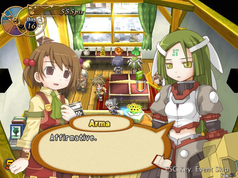 While the actual selling mechanics are rather simplistic, the overall economy of the game is thankfully complex. Much like a real-world stock exchange, the prices of items fluctuate. Like any real business owner, you will need to capitalize on these price fluctuations. When market prices of certain items go up, you should try to sell as much of your remaining stock of that item as possible for the increased profit margin, while making a conscious decision not to buy more of those goods. When the market price of a given good goes down, refrain from selling your current stock, buy more of it on the cheap, and sell it later when the market price normalizes for a major profit. This emulation of the business world is the where most of the enjoyment of the game comes from, as making money is fun even if its in the fictional Pix form. And your business will grow. One of the most satisfying things about Recettear (and other games like Harvest Moon, FarmVille, and even Diner Dash) is that your operation starts out as a timid, unorganized corner shop to a well-decorated, oft-frequented, and (hopefully) well-stocked town staple.