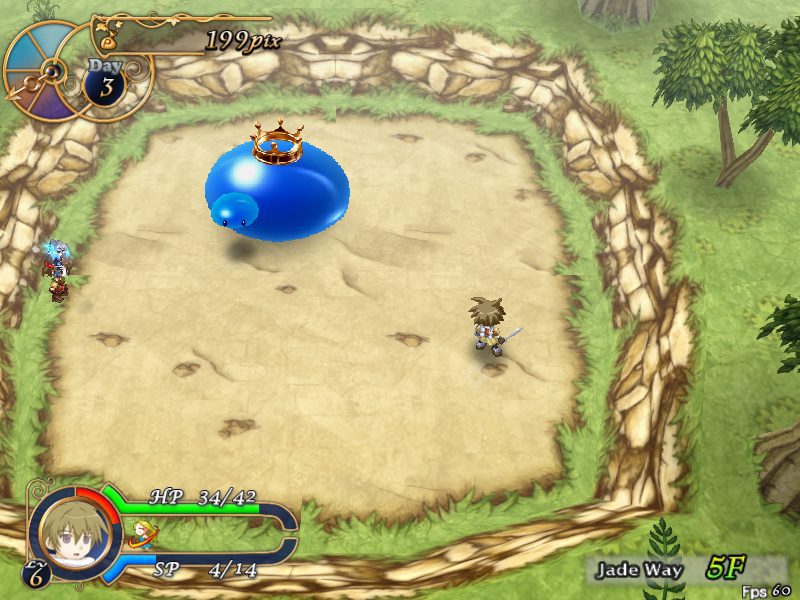 The setup is pretty clever, but the story loses a lot of its overall potential, as the game’s premise is a perfect opportunity for RPG in-jokes and meta-humor about how the RPG genre relates to real life. Few of these jokes are made, which is disappointing, but the game does have its own quirky sense of humor in its own right. For instance, one of the characters tries to sneak into the item shop in a box, only is box is a .jpg of an Amazon.com box surely taken off a Google image search. In addition, you even have some homage to other RPG franchises as the boss of the training dungeon is an obvious parody of a King Slime from the Dragon Quest series, complete with a crown that seems to also be a terribly cropped .jpg of an actual crown. The story as a whole is nothing to write home about, yet these crappy-for-the-hell-of-it gags really add some flavor to an otherwise bland dish.