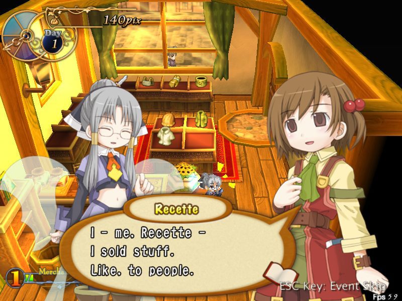 Recettear is one of those anomalies in gaming that just may be a start of a new trend or be a barely noticed blip on gaming history. Recettear, along with Rockin Android titles like Suguri and Gundemonium, is one of the very first officially distributed Japanese doujin games on a mainstream American digital service. It was initially released in 2007 and developed by EasyGameStation, who started out with fairly simplistic (but fairly decent) games like Duo Princess and Gunners Heart, before graduating to the fairly in-depth action-RPG Chantelise. Recettear was localized and published by Carpe Fulgur, their first title. It is also the first doujin title to appear on Steam, with a reasonable asking price of $20, approximately what the game costs in Japan.