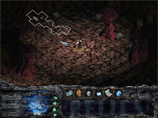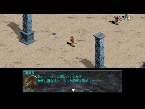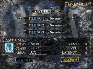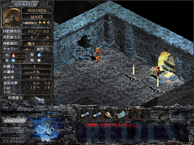While the main premise of Relics, possessing the defeated enemies’ bodies, is still present in this game, it plays like quite differently. Unlike its side-scrolling adventure predecessor for PC-98, The Recur of Origin is now an isometric action-RPG with significantly simplified controls – almost everything that the player can do could be done with nothing but the mouse, which is an improvement for the best; both mouse buttons are essentially multipurpose, with such functions such as movement, talking and fighting delegated on the left one, while using items in inventory and special attacks are done with the right mouse button. Every living creature in the game has usual stats for the genre, like hit points, special attack points, dodge rate and accuracy, resistances to the 4 elements present in the game and a special stat used by player only, called latency.