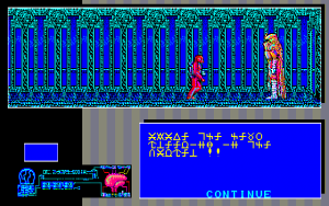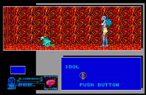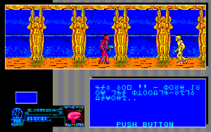 The first thing the player sees after booting the game is a text about two ancient forces opposing each other, stuck in a pointless conflict in which there is no good or evil, no light or darkness, just two forces, which doesn’t provide much information on what is happening. As will be explained later, the part mentioning moral ambiguity of these two forces isn’t exactly correct. Once the text has scrolled all the way up, a cutscene plays, showing a fortress rising from under a sea during a storm, and then giving the player a view of the many ziggurats atop the stone castle, all while a recreation of Crystal King’s song “Woman” plays. A very impressive sight for a game made in 1986.