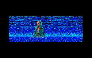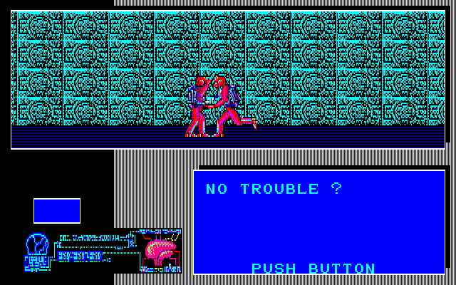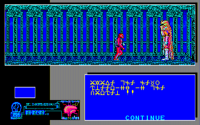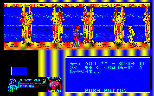 Once the cutscene is interrupted by a key press, the player is once again welcomed by a beautiful sight rich with details: a disembodied shade can be seen in front of a stone wall, with water in the background and a deep hole by the side. The graphic design of the game is clearly inspired by works of H. R. Giger, albeit with some distinction: most of the characters look like some sort of an insectoid monstrosity or are hidden inside futuristic armor, albeit it’s sometimes hard to notice due to the screen resolution common at the time – it’s more noticeable in the manual that comes with the game. However, the moment the player tries to move, a very significant flaw can be observed – the input is quite laggy; the impressive visuals take quite a lot of processing power, even with all the workarounds like repetitive patterns of a wall in the back.