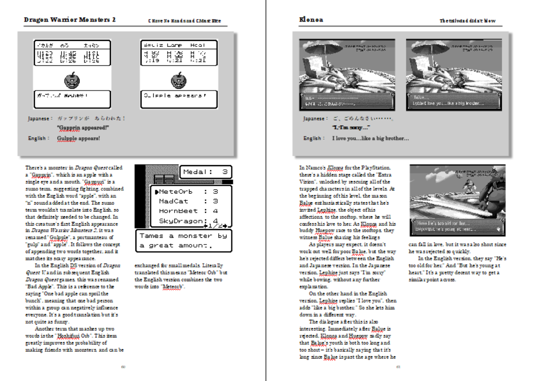 This series takes a look at something specific in a game – typically a line of dialogue, but sometimes a name – compares the two, and then offers some ideas about what might have changed in the trip from Japanese to English. Sometimes it’s an idiom that doesn’t translate, sometimes it was something that was rewritten slightly to make it read better in English, sometimes the English localizer tossed out the original Japanese entirely and wrote their own text, sometimes the Japanese text would’ve been considered inappropriate due to cultural differences, and so forth. The books are both about 100 pages long each, with a handful of columns with additional insights. The first book covers games from the 8 and 16-bit era, while the second book covers games from the 32/64-bit era, like the PlayStation, Saturn, and Nintendo 64, along with some Game Boy Color games.