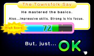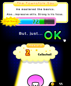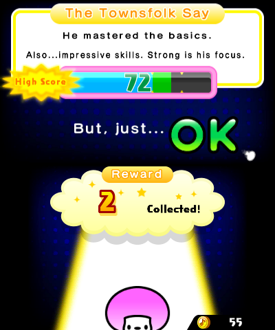 There are plenty of quality-of-life improvements that are geared towards new players but longtime fans will definitely find welcome. The bottom screen reacts whenever you press a button, indicating how close you are to the beat, with the middle of the screen exploding in stars if you get it perfectly. The tutorial even kindly displays the proper inputs if you screw it up enough times, which particularly helps in the tougher games like the tango one. A score meter at the end shows exactly where you are on the “failure/ok/superb” range – it’s even kind enough to let you go on even if you fail it very slightly.
