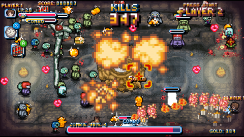 The world is in danger because some scientists did science and made an evil giant brain and now there are zombies. You have to shoot the zombies and kill the evil giant brain. Simple and to the point premise, perfect for setting the stage for the chaos ahead. You start the game selecting from a pool of characters and get to blasting through a small selection of levels that make up for their low numbers by being quite long. The goal is to blast through and survive waves at set points, then destroy a boss at the end to move to the next level. You can also collect sub-weapons that can stop time or do massive damage to every enemy on screen, and they’re rare to come by, so use them wisely.