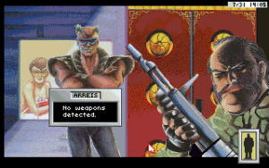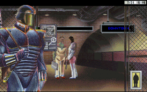 Rise of the Dragon is played entirely with a first person perspective, using some gritty hand drawn artwork for its backgrounds and portraits, along with a handful of few black and white digitized images. Stylistically, it looks pretty good, although the scanned drawings suffer some dithering due to the 256 color limit. Navigation is quick and easy, although it takes awhile to adjust to the game’s attention to realism. For example, it’s entirely possible to forget your card key in your computer and leave, effectively locking you out of your apartment. (There is a way to get back in, although it’s a bit obscure – you need to hit the steam valve in the apartment hallway, but there’s no hotspot to indicate that you can interact with it.) Taken even further, you can also forget to put on your clothes and end up getting arrested for public indecency. The first few “puzzles” of the game seem to revolve around not forgetting to pick up certain items, in ways that aren’t always logical. (Who leaves a key in a lock after opening a door, honestly?) A lot of this is done to make the game more realistic, which the game otherwise does more admirably. Certain locations change and have different inhabitants or even music every time you revisit them, which goes a long way towards making the Los Angeles of the future more alive.