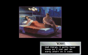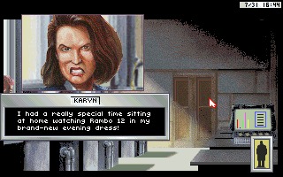 Beyond some of the initial “gotcha” moments, Rise of the Dragon isn’t terribly hard nor terribly long. Most of the puzzles are logical and straightforward, and a number of them simply involve navigating through dialogue trees without pissing off whomever you’re talking too. Unfortunately, the “right” answer isn’t always apparent – sometimes you need to play the wiseass, sometimes you don’t – and getting it wrong means that they’ll stop talking to you completely, again, forcing a reload. You also need to be careful about not pissing off your girlfriend, Karyn, who also happens to work in the city’s Bureau of Records. If you manage to find yourself in the doghouse, via saying something stupid, or forgetting a date with her, or picking up a prostitute, you are, once again, stuck in an unwinnable situation.