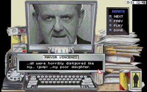 Per usual adventure game protocol of the late 80s/early 90s, there are a handful of action sequences. One is a fairly painless shooting gallery, wherein you use your mouse cursor you shoot enemies, but two others are side-scrolling console style segments. Both are abysmal, with stiff and lumbering controls, aggravating insta-kill obstacles, and enemy shots that are impossible to dodge. At least the computer versions let you skip these after failing them five times. Beyond these, there’s a truly aggravating puzzle involves wire tapping into an electric box, which is only really irritating because the clues you’re given are quite vague, and you’re under a strict time limit.
