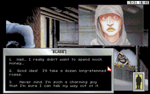While Blade’s relationship with Karyn isn’t really much of an issue beyond the opening steps of the game, she ends up captured by Bahumat’s group, and found strapped to an operating chair, as a timer counts down to inject drugs into her system. If you screw up, she’ll morph into horrific, bulge-eyed reptillian monstrosity before your very eyes and die in Blade’s arms as he swears revenge. It’s pretty rough to watch, although saving her isn’t too difficult. The ending changes depending on whether or not you save her, although keeping with the detective noir sensibilities, even the good ending isn’t particularly upbeat.