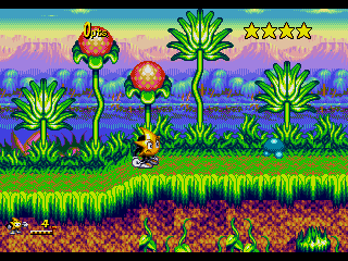 On first impressions Ristar does feel a lot like Sonic, at least from the perspective of game structure. Each level has two normal stages, the first one ending with some sort of unusual mini-boss encounter, and the second stage leading into a boss battle. The game code itself is based on some of the previous Sonic games; some sound effects are recognizable to those who have played them, and the game engine is also based on that of Sonic 1. Within each normal stage is a hidden entrance to a bonus stage where the player tries to grab a special item and possibly get a continue. Ristar’s silhouette is reminiscent of Sonic, with 3 visible spikes rotruding from his head. Ristar himself is, after all, based on an early concept for Sonic that was canned for the sake of gameplay that wouldn’t require the player to use more than one action button in order to do anything to simplify and speed up gameplay.
