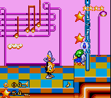 The similarities continue. One of Ristar‘s level inpirations is taken straight out of the SNES Sparkster: it is a music-based level with obstacles like timpani drums that act like trampolines and piano-based platforms that plunk out notes as you stand on them. The bonus stages, unlike in Sonic the Hedgehog, don’t use a different engine and are more like Dynamite Headdy‘s tutorial levels: played in order to unlock codes at the end of the game and also for continues (if cleared quickly enough), they involve using skill with various common level design elements like the previously mentioned poles, trampoline-drum platforms, and other obstacles like monkey bars and grabbable ledges.