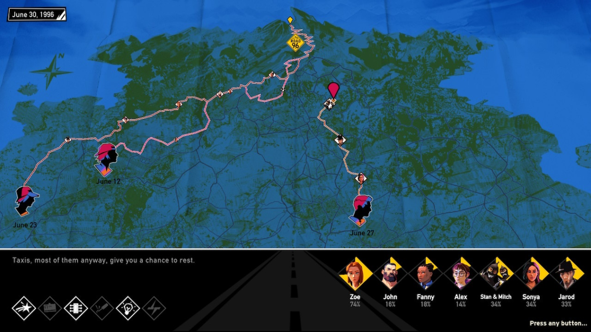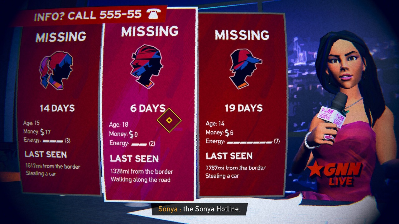 Eventually, at the end of a trip, you will reach Road 96. Road 96 leads to the border of Petria, where after spray painting a slogan from a list of several choices, you can attempt to escape through one of several means, each of which is closed off for the next trip, forcing the next refugee to try a different tactic. You can also choose to leave money behind to help other people who are trying to escape. When the next trip begins, a news report by Sonya will dishonestly describe what happened in the previous trip, the current polls will be shown so you can measure the direction of the country and likelihood of getting the desired ending, and the next playable teen can be selected from a random group.