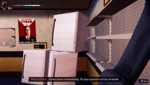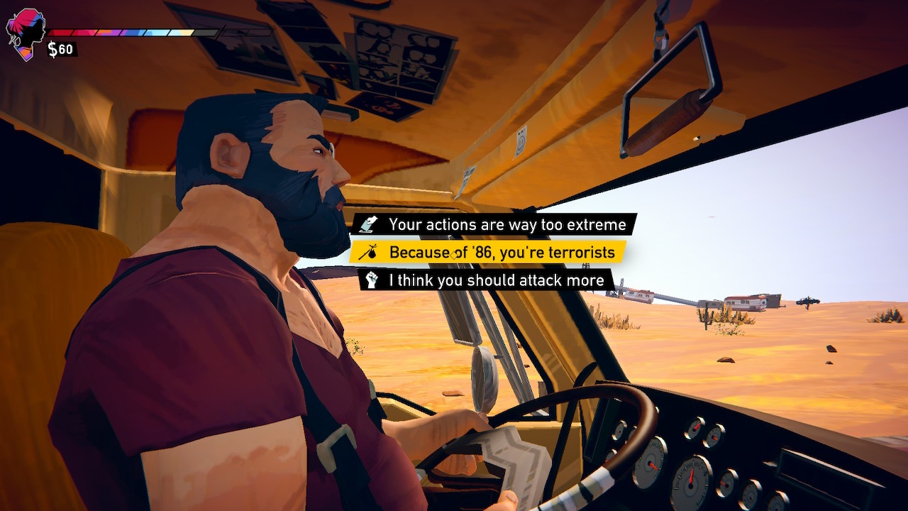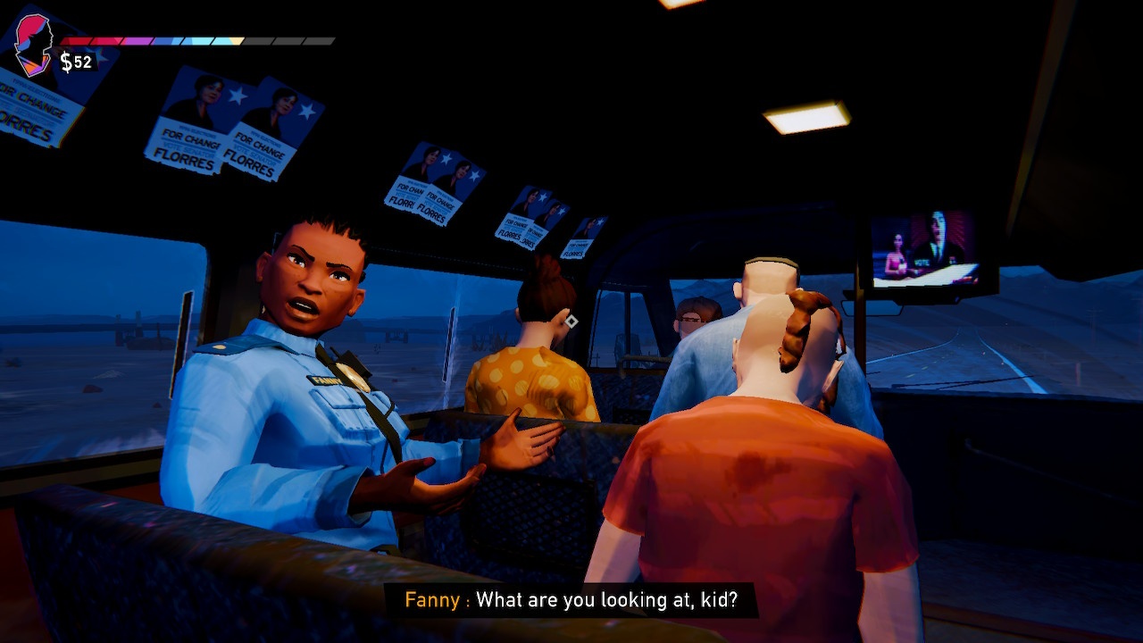 Road 96 has a very fleshed out setting and atmosphere. Characters often reference other characters or events in the story, including things you did on a previous trip. Many people have opinions on what’s happening in Petria, and aren’t shy about expressing them. Tyrak and Florres supporters often put their posters up on walls or in their cars, making it very clear which way they lean, while some people are apathetic or apolitical. Even the people who hate Tyrak are divided on whether or not Florres will be a good replacement.
