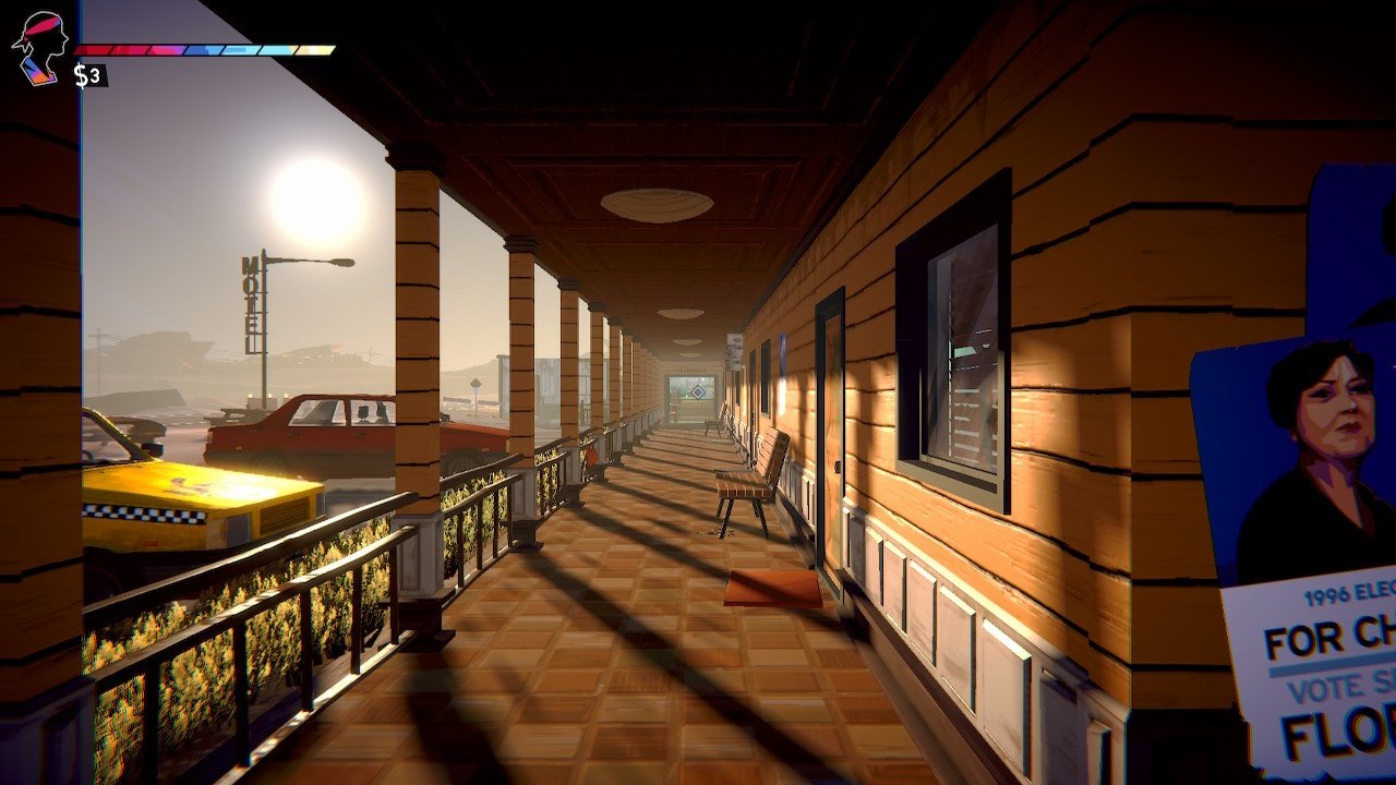In one chapter, you come across a two-story motel. There are posters for Florres everywhere, along with Black Brigade graffiti. Cars driving by blast slogans for Florres, Tyrak, or both, depending on each candidate’s current standing in the polls. A pay phone allows you to call home for a dollar.