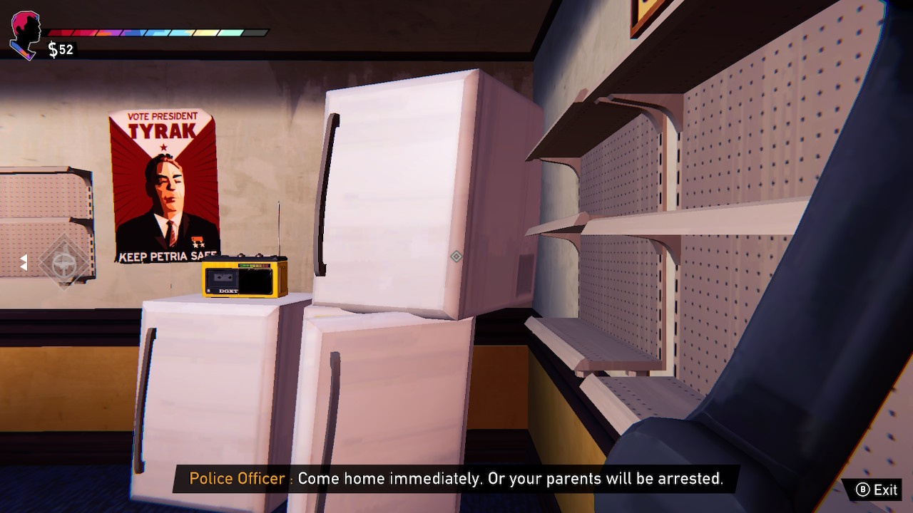 Player choices such as vandalizing Florres or Tyrak posters, stealing money, and eating rotten food, all influence the direction of the country as well as your “karma.” Tyrak gains more supporters if you go on a shameless crime spree, so while you do need money to buy food, and food in order to live, whether or not to steal is a choice that should be measured carefully. There are ways to earn money that don’t involve stealing, and sometimes they can be even more lucrative. There will even be times when the player is asked to do something for a person, such as film someone on camera. Deliberately not doing what you’re supposed to (in this case, pointing the camera at other important things instead) can also impact the story.