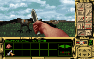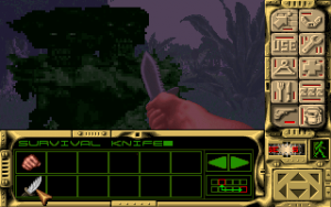 At the time of release in 1994, Robinson’s Requiem didn’t really fit into a standard genre, being something like a first-person adventure/RPG hybrid, but nowadays it’s what we would term a survival simulation. While the Ishar series from developer Silmarils use the standard grid-based movement seen in many other first-person RPGs of the 1980s and early 1990s, Robinson’s Requiem features fully 3D movement. Much of the time is spent wandering the open world, but simply exploring and finding everything you need to succeed isn’t enough, because you have to deal with the effects of the environment as well as your own fragile body. Get attacked by an enemy and the wound may become infected. Fall too far and you’ll break a limb or two. Swim for too long and you’ll catch the flu. Forget to eat and you’ll starve to death. The number of ways you can die include, but are not limited to: alcoholic overdose, dehydration, asphyxiation, electrocution, hypertension, exhaustion, hypothermia, poisoning, blood hemorrhaging, heart attack, cold water shock, and plain old violent trauma.