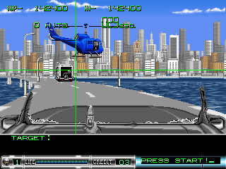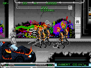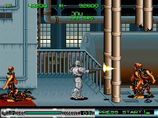 The game is a combination of a belt-scrolling beat-em-up and a run-and-gun. RoboCop is always equipped with a pistol, with two separate buttons for shooting right and left. He can also punch and body slam enemies if he gets close enough, and there are a handful of other weapons too, like bazookas. The stages are broken up with a few sections where RoboCop turns towards the background and fires at approaching bad guys. These segments are reminiscent of gallery shooters like Cabal. There are also a few bonus stages which take place in a first person perspective, as you ride a police cruiser down the highway and target enemies.