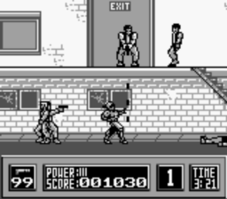 The second version of RoboCop was released for the Commodore 64, IBM PC, Amstrad CPC, ZX Spectrum, and Game Boy. Like the arcade game, it’s pretty simple – trudge forward and shoot stuff. There are four types of weapons, though, which you can switch between if you have ammo. There are only four stages in the C64 version, compared to the seven of the arcade game. It follows the same rough progression, from the city streets, through a junkyard, then to the OCP building. It also includes the hostage shooting gallery and face matching segments of the other computer ports. These ports do have good music, though, especially the oddly calming title theme. (Bizarrely, the same song was used in a commercial for Ariston-brand washing machines in England.) These are all okay run-and-guns considering their platforms, but they’re also overly difficult. This is especially true of the Commodore 64 version, which barely gives you enough time to finish some of the later stages.