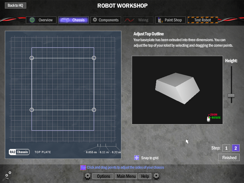 Whereas the original Robot Arena was a simple affair that locked the player into one of a half-dozen premade chassis shapes players of Robot Arena 2 will see these restrictions completely obliterated right from the start. Instead of picking a chassis the game provides the player with a digital sheet of graphing paper where points can be placed to make a chassis as big or small as desired and in whatever shape the player can think up. There are some limitations with the 3D engine that prohibit obvious things such as intersecting points but for the most part if you can dream it you can literally plot it out and build it. Tools are even provided to help easily plot out circular shapes if it’s a spinner-style robot you’re itching to create.