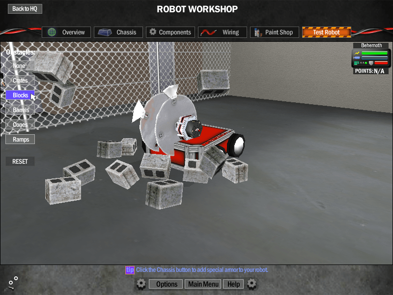 After designing a blueprint the next step is to choose an armor and this is where another quality of life improvement shows up: the removal of the money system. Robot Arena was unfriendly to design freedom with its constraining in-game cash system that limited what beginner players could build. Now there’s no limit; the metaphorical leash has been taken off and from square one players can build their dream machine. Because there’s no cash instead players will notice weight plays a more critical role in what they build because Robot Arena 2 introduces a rudimentary weight class system; robots can either be lightweights, middleweights, or heavyweights. These classes are loosely based on the popular BattleBots television show with the notable omission of the “super heavyweight” class of robots. Given the generous weight allowance between becoming a heavyweight and hitting the in-game weight limit there’s reason to believe a super heavyweight class was considered but left out for unknown reasons.
