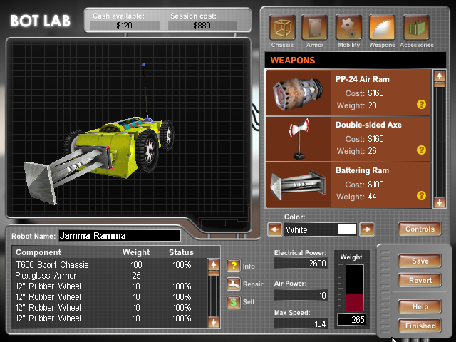 Robot Arena is a simple affair. You start with $1,000 in your profile and from here you have to build a competitive machine capable of tackling the game’s Tournament mode. Unfortunately $1,000 is barely just enough money to build yourself a cheap ram-bot with the most inexpensive armor, wheels, and batteries. If you’re not aware of this you’ll promptly run out of funds and discover that selling your parts back to the Bot Lab doesn’t offer a 1:1 return on what you paid for them; you’ll probably have to delete your profile and make a new one to start over to get another one grand. The money system is probably the worst aspect of Robot Arena because newcomers to the game won’t have a complete picture on what it takes to build a robot and all of the required components will bankrupt them unless they do things on the cheap right out of the gate. It’s easy to be sidetracked with all the other parts and weapons on offer.