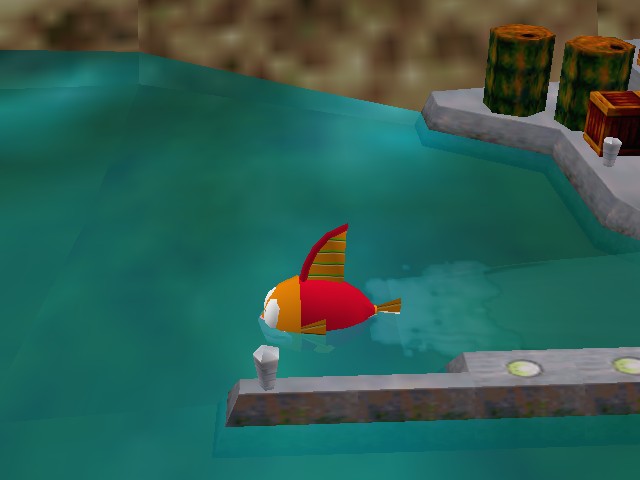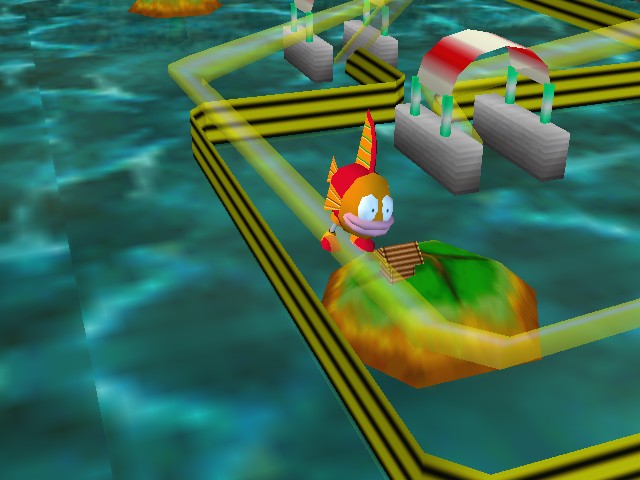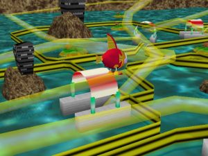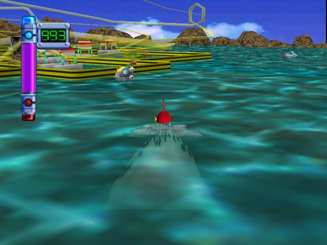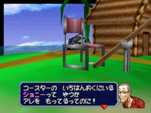 The graphics are also striking for an N64 title. On the ship, characters are shown as 2D sprites wandering around a relatively detailed 3D environment. Battles themselves look great: the 3D Robopon obviously had a lot more effort put into them than any other aspect of the game. The only negative aspect is the drab world map. All opponents and islands look the same, making it difficult to easily navigate the open sea. Sometimes the player gets to travel through an ugly maze of roller coaster tubes that function as a linear dungeon with see-through walls, although the silly pan and zoom camerawork can’t make up for the barren visuals.