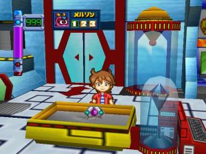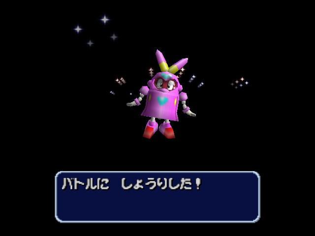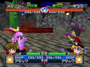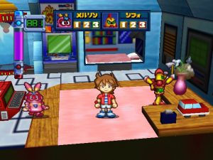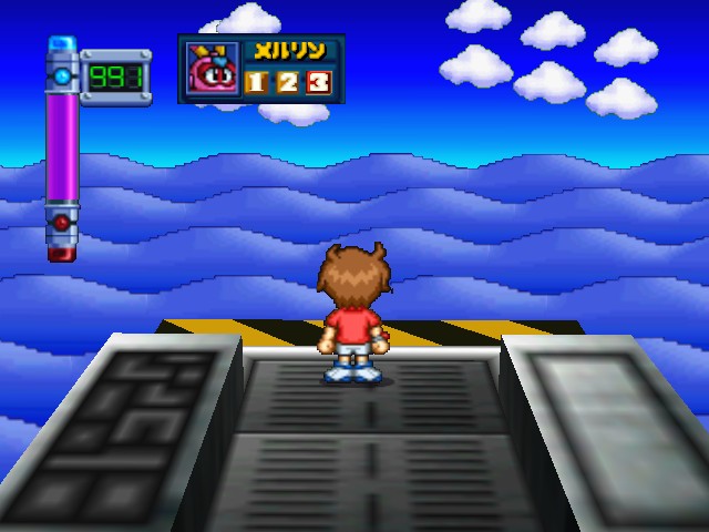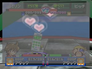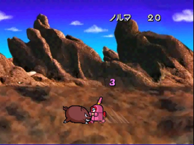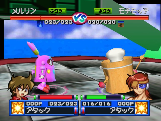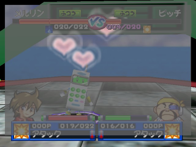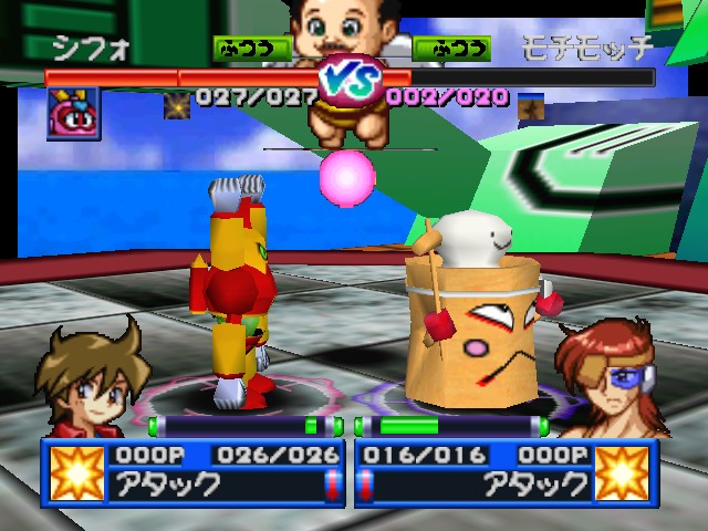 Robot Ponkottsu 64‘s most drastic change is to how battles play out. Whenever you fight, you enter a real-time 3D battle in a large arena circle. Abilities must charge up before using them and positioning becomes very important as long-range attacks can be easily dodged. Certain strong Robopon have faster charge bars, specifically in the tougher boss battles. A small-winged man named Mr. Brownie, who occasionally appeared to give the player some special items in the last game, randomly drops a ball into the arena that gives the player a quick HP and EP boost.