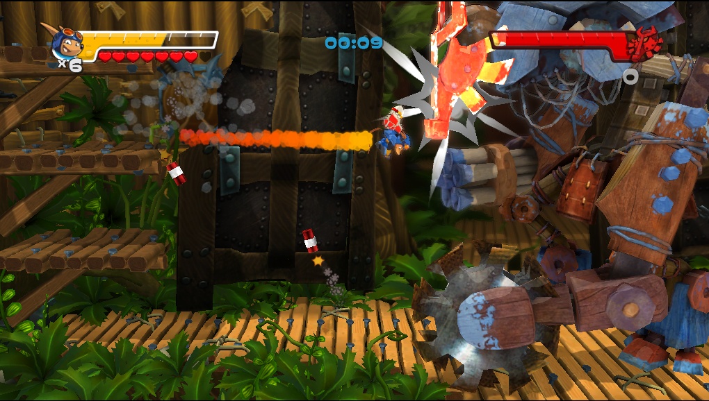 Rocket Knight was developed as a downloadable title for the Xbox 360, PlayStation 3, and Windows-based PCs. Rather than going the route of Konami’s ReBirth titles, which used low-res 2D assets, Rocket Knight uses entirely 3D graphics, although the whole game is still played on a two- dimensional plane. While the graphics don’t really take advantages of an fancy high-definition effects, it still looks decent and plays smoothly, generally running at a rock-steady 60 FPS, a vital requirement to any 2.5D game. The new artwork for Sparkster also looks pretty excellent. The overall visual style is a little bit more cartoony, vaguely reminiscent of Namco’s Klonoa series. Like the original game, the adventure starts off amidst a forest background, before moving through medieval castles, and eventually to a futuristic sci-fi setting. There are four stages in total, each consisting of two main substages and a boss battle. While not terribly long, it’s still a bit lengthier than the 16-bit games, and also saves your progress in between stages, although it still nonsensically keeps track of lives and continues. The soundtrack also includes a remix of the original theme from Rocket Knight Adventures. The rest of the music is pleasant, albeit incredibly bland, and generally just blends into the background.