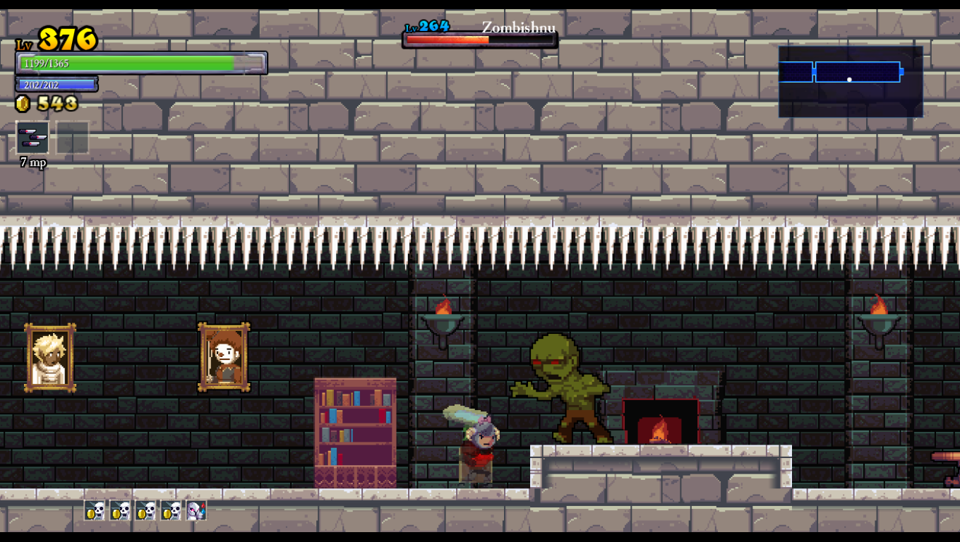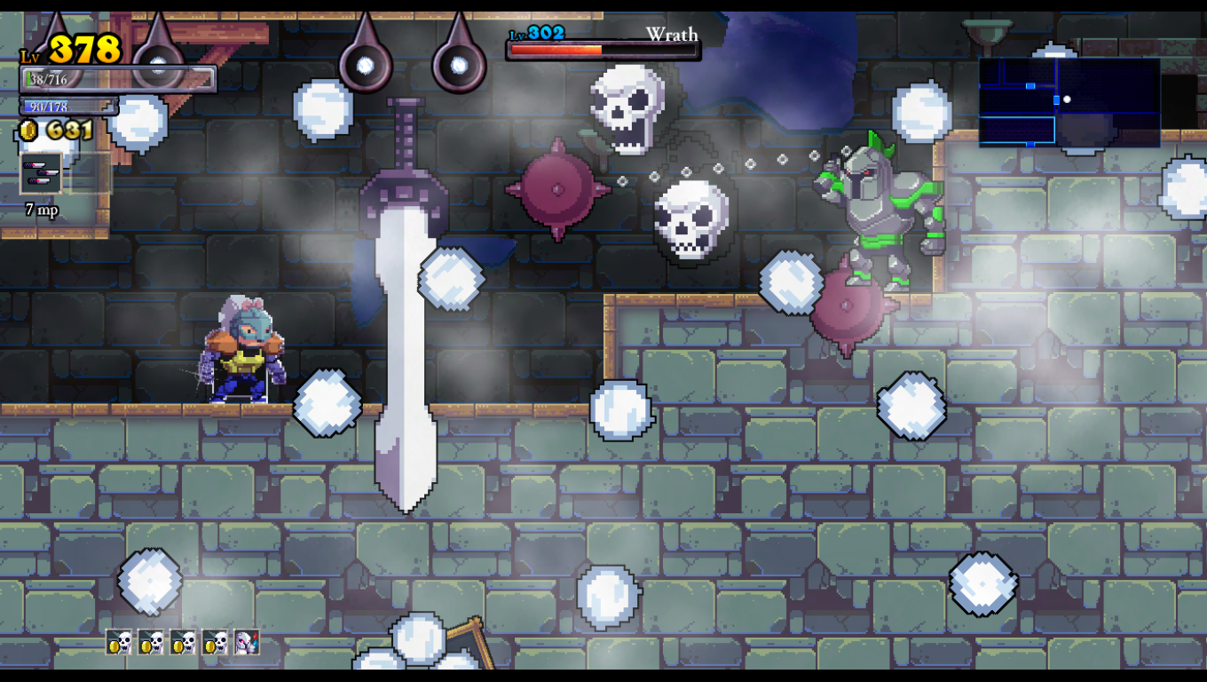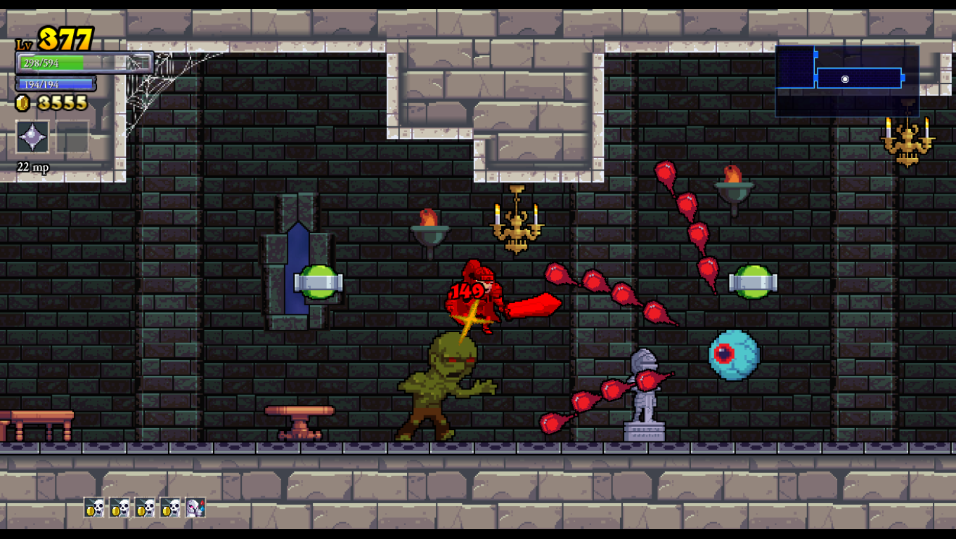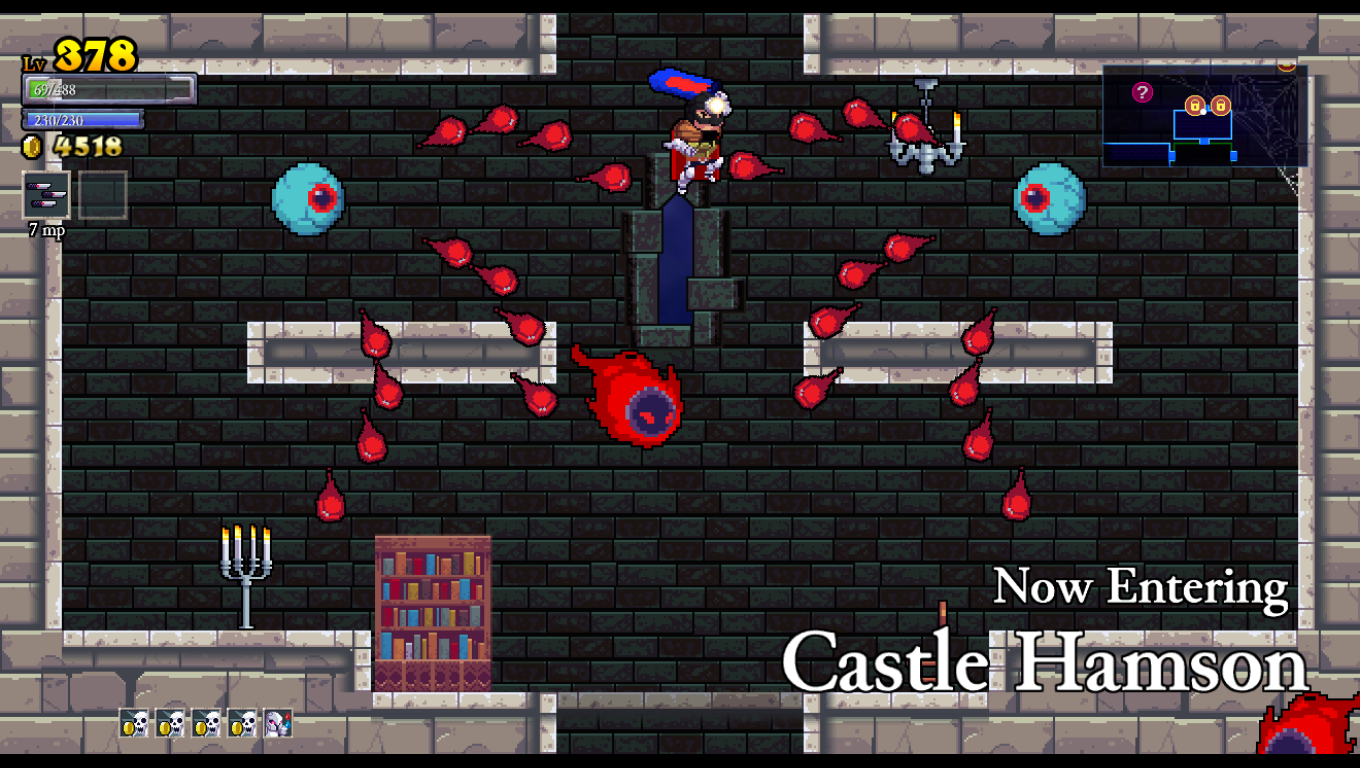After picking your next hero, you’re off to Hamson, where your goal should ideally be focused more on finding gold than fighting the bosses. Various enemies stand in your way such as evil knights, floating skulls, immovable zombies, elemental wizards, possessed paintings and other such demons. Enemies sometimes fork over gold when defeated, but you don’t actually gain experience points from them. Your gold IS your experience for all intents and purposes, and you can also collect money from the many treasure chests strewn about. However, some chests require you to navigate through spikes and/or fire traps to reach, and others require you take no damage or they lock up and become unobtainable. These are “fairy chests” which contain blueprints or runes which can add stats and abilities to your characters. Sometimes, you have to avoid taking damage, or you have to not hit enemies, unable to jump, reach the chest before a timer runs out, and so on.