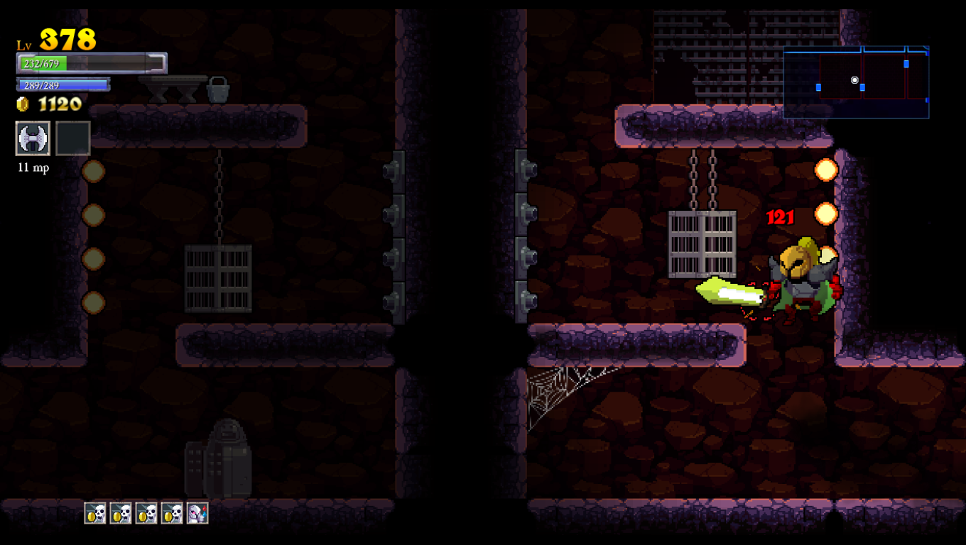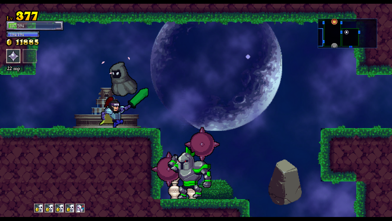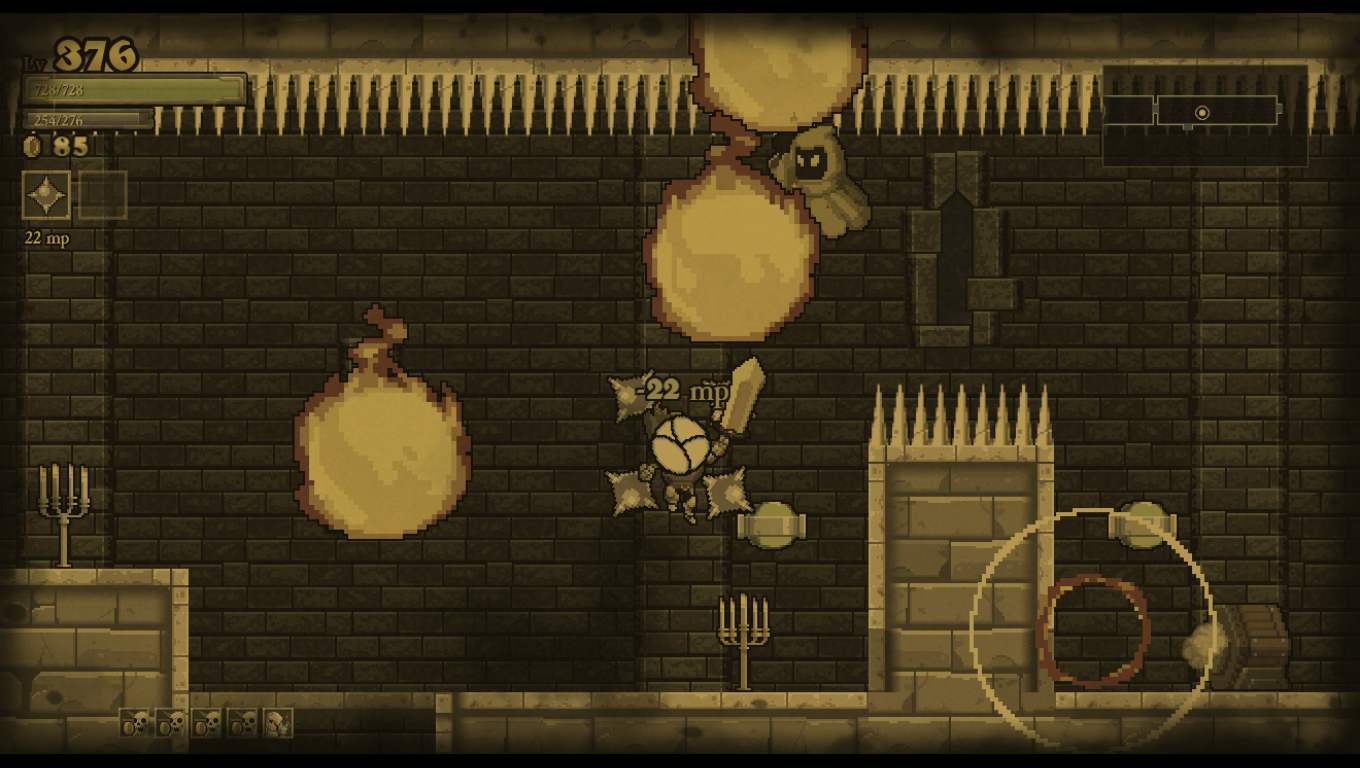 Rogue Legacy is a game where death is inevitable. Arguably, it is even encouraged. Your main goal is to defeat the four bosses of Castle Hamson and its adjoining areas: The Forest Abkhazia, the Maya, and the Land of Darkness. Your knight carries a big sword in a perpetually doofy fashion, raised towards the skies while marching about heroically. Such bravado makes it unfortunate that your first earnest attempt will likely end in being murdered by the castle’s monsters or traps. Whenever this happens, you get to play god and choose one of three different descendants with randomized traits. All knights have their sword and a randomly-decided spell for a subweapon, ranging from familiar daggers and axes to scythes, bladed chakram, and more esoteric attacks. Each new child will be one of ten classes, such as knaves with increased critical hit chances, barbarians with super-high hit points, and spellthieves with the ability to steal magic points by hitting enemies. They will also have one or two traits picked out of a possible thirty-five, some of which are beneficial (gaining magic points for destroying objects), detrimental (flipping the entire screen upside down), or just goofy (swearing every time you get hit and when you die).