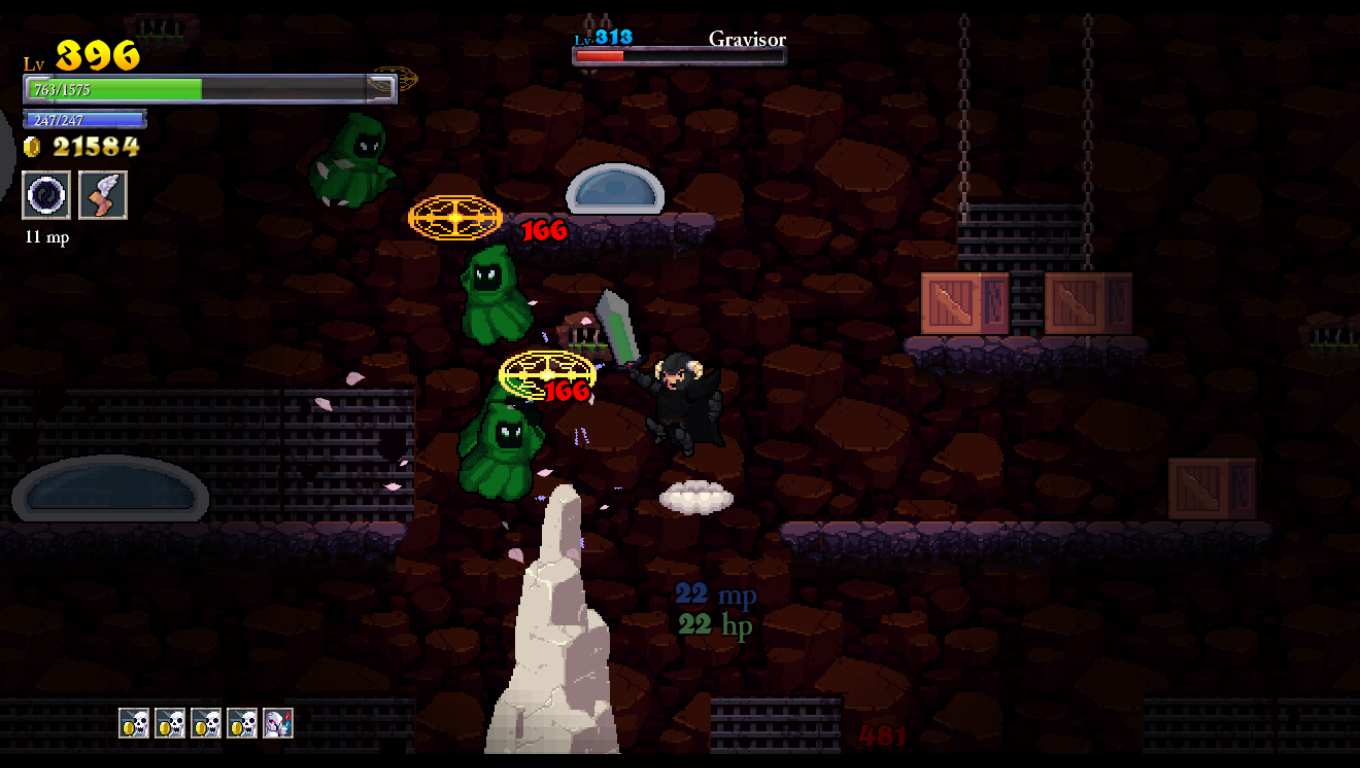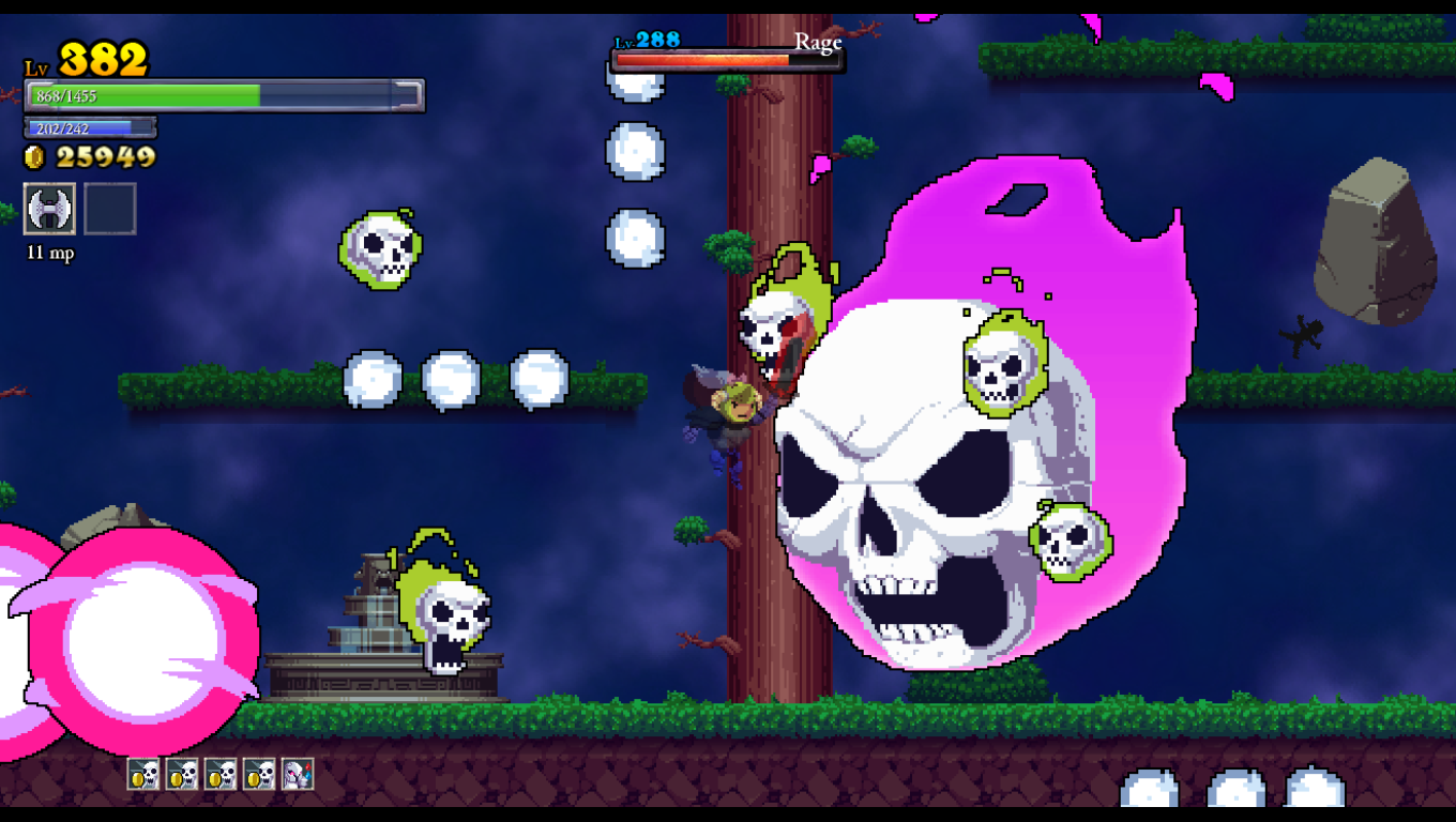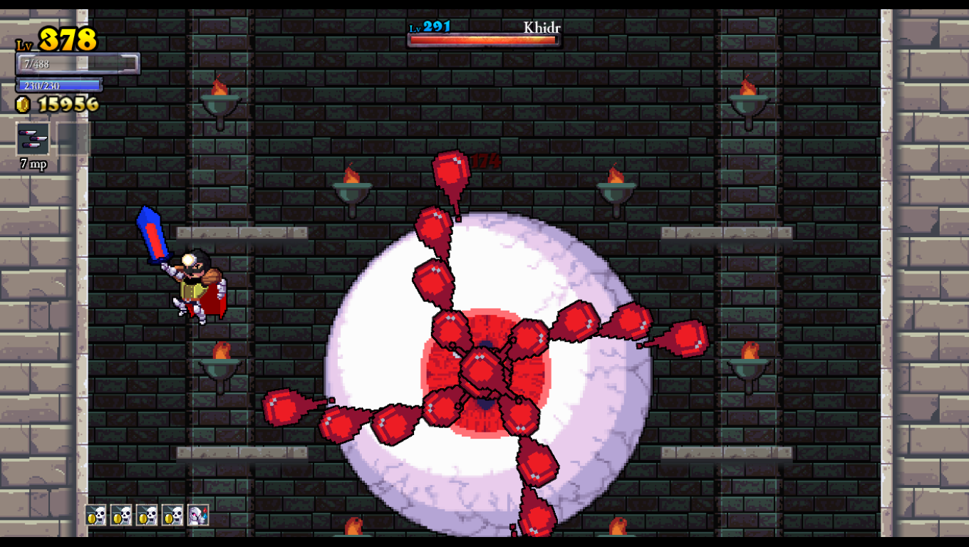 Rogue Legacy is a game where death is inevitable. Arguably, it is even encouraged. Your main goal is to defeat the four bosses of Castle Hamson and its adjoining areas: The Forest Abkhazia, the Maya, and the Land of Darkness. Your knight carries a big sword in a perpetually doofy fashion, raised towards the skies while marching about heroically. Such bravado makes it unfortunate that your first earnest attempt will likely end in being murdered by the castle’s monsters or traps. Whenever this happens, you get to play god and choose one of three different descendants with randomized traits. All knights have their sword and a randomly-decided spell for a subweapon, ranging from familiar daggers and axes to scythes, bladed chakram, and more esoteric attacks. Each new child will be one of ten classes, such as knaves with increased critical hit chances, barbarians with super-high hit points, and spellthieves with the ability to steal magic points by hitting enemies. They will also have one or two traits picked out of a possible thirty-five, some of which are beneficial (gaining magic points for destroying objects), detrimental (flipping the entire screen upside down), or just goofy (swearing every time you get hit and when you die).