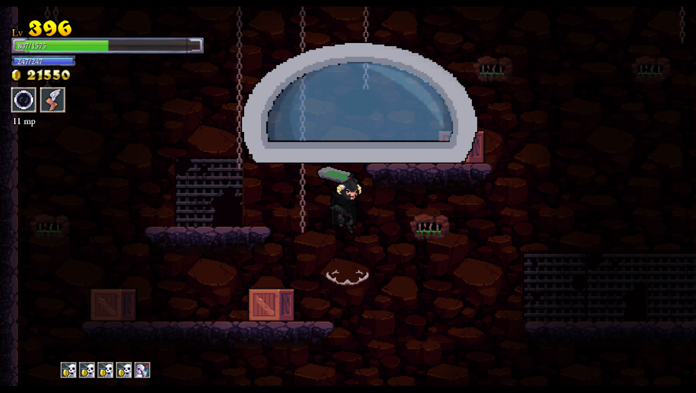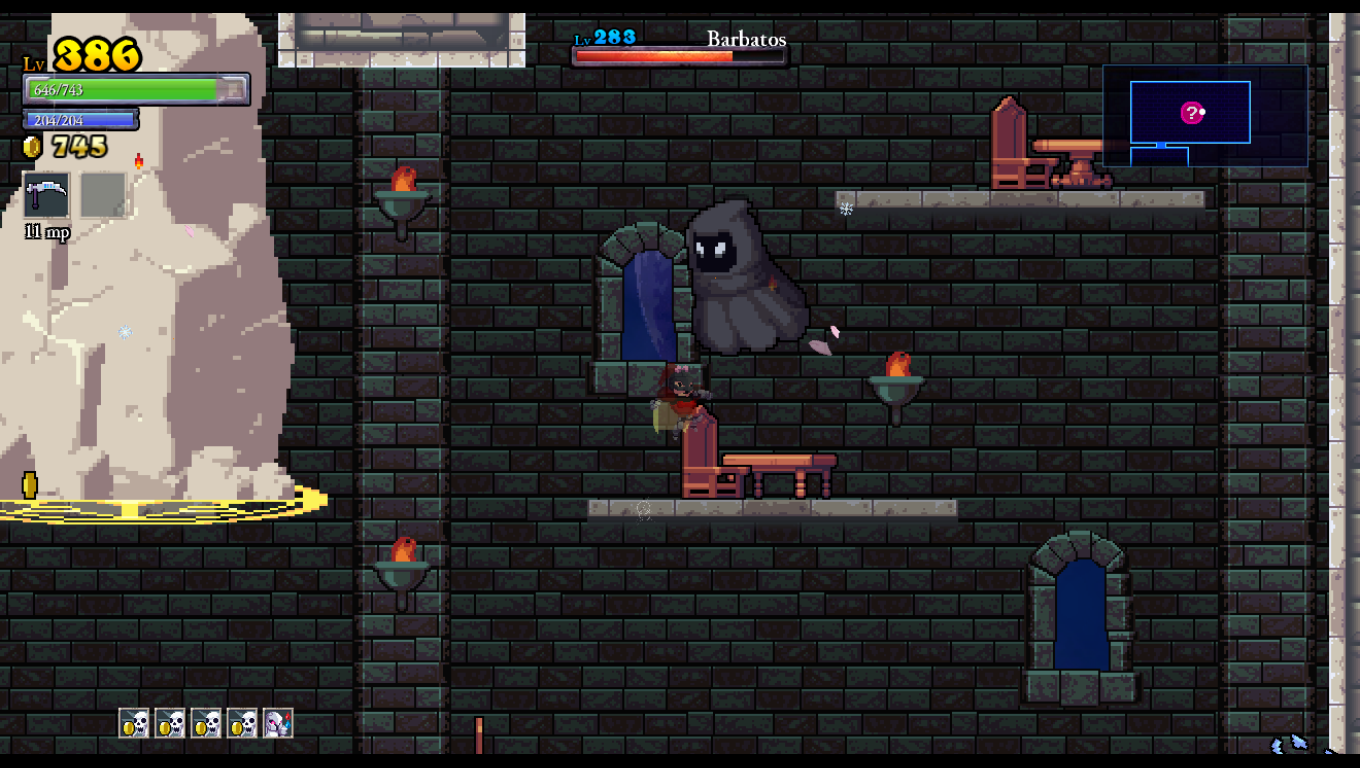 There are several other things to watch out for in each castle besides money and equipment, like journal entries that shed some light on the backstory, mysterious statues that give you special items that stay with you until the next death, a trollish clown that gives you rewards if you can beat one of his difficult minigames, and even giant paintings that give information on Cellar Door’s past projects. Above all else, what you’ll most want to be looking out for are the boss rooms, which have teleporters in them in case you lose and want to have the architect lock the castle for quick re-access. The boss fights can be quite overwhelming when you first face them; for instance, the first boss, Khidr, is a gigantic eyeball that shoots out projectiles in patterns not too far removed from a bullet hell shmup. All bosses are technically much bigger versions of normal enemies and may share some familiar behaviors, but they all provide tough challenges that will likely require several upgrades to defeat. Thankfully, destroying a boss is the only thing about the castle that stays locked once you’ve done it, so you don’t have to take on all four in the same run. Once you’ve conquered all four bosses, the ominous door in the castle’s first room opens up and you face the final boss, whose presence brings the normally muted plot full circle into a surprisingly dramatic conclusion.