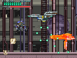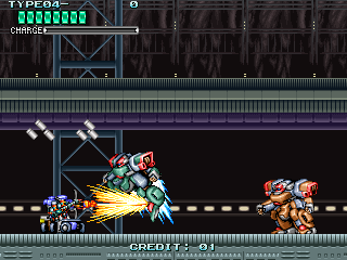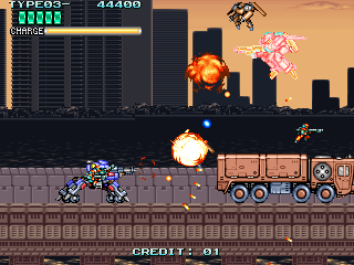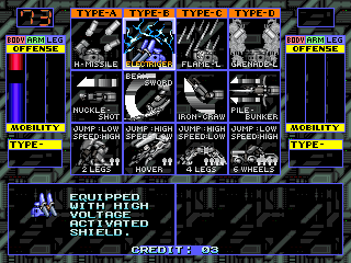 When you select your mecha, you can choose from four pre-constructed ones with different strengths and weaknesses, similar to Vapor Trail, but you can also build your own. You can customize your melee weapon, your shoulder (secondary weapon), and your legs, with a total of four parts of each type. Your shoulder weapons need to be charged up by holding down the attack button for a few seconds, but naturally are the strongest. These consist of grenade launchers, homing missiles, flame launchers, and an electric field. Your left arm functions as a melee attack and is activated automatically when you’re close to the enemy. These attacks are comprised of your mecha’s fist (called “Nuckle Buster”), an iron claw, a beam sword, and a pile bunker.