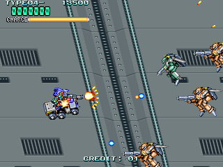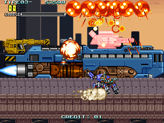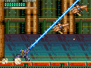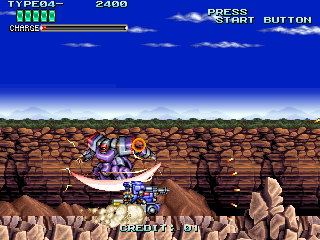 Although you couldn’t tell directly from looking at it, Rohga: Armor Force (known in Japan as Wolf Fang: Kuuga 2001) is actually meant to be the follow-up to Vapor Trail. There have been a few changes in between games, though. For starters, the genre has shifted from a vertical shoot-em-up to a side-scroller. Also, rather than controlling a fighter jet, you now pilot a gigantic mecha. This all combines to make things feel more like an action-platformer in the vein of Contra. The screen now scrolls automatically, as well, which also kind of makes it similar to Data East’s previous cult classic, Atomic Runner Chelnov.