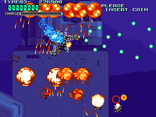 You can also assemble your legs, include the standard two-legged configuration, one with hover jets, a four-legged model, or tank treads. Your standard weapons change depending on what power-ups you find. You can obtain a laser rifle, Vulcan machine gun, grenade launcher, and a cluster gun. You can also pick up tiny little buddy robots that ride on your mecha, which provide extra fire. They’ll scatter if they get hit, but you can easily pick them up again. Given how much firepower is at your disposal, your mecha is also surprisingly agile. You could do stuff like this in Target Earth for the Genesis, but this type of customization is pretty unprecedented for an arcade game.
