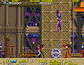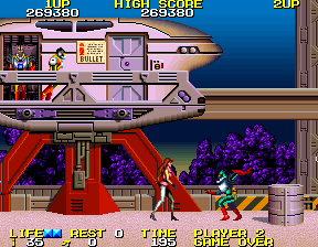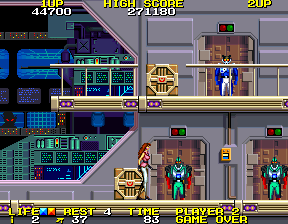 One of the biggest draws is the two-player mode. The heroes are named Albatross and Leila, though due to the time jump between this and the first Rolling Thunder, they’re obviously different characters who inherited the codenames of their predecessors. Considering that the female character was just a damsel-in-distress in the previous game, it’s cool to see the lady here take on a more active role.