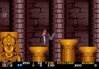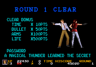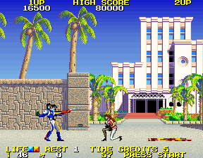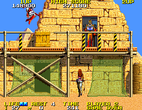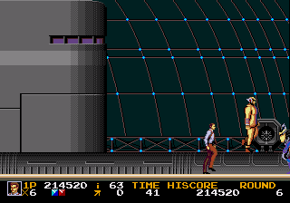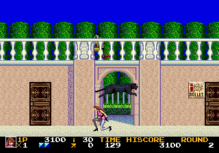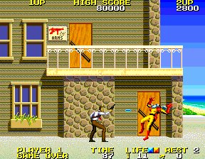 Rolling Thunder 2 takes the series out of the 60s and into the modern era, with a style that more closely apes the latter day James Bond flicks. The enemy this time is an organization named Gimdo, who is using old technology from Geldra in order to take over the world. Instead of taking place solely in a generic underground base, there are two locales – the first half of the game takes place in a fancy tropical villa, and the second takes place in Egypt. As you progress through each stage, you slowly work through the façade and into the underground lairs, with scenery more typical of the original game, though with upgraded graphics.