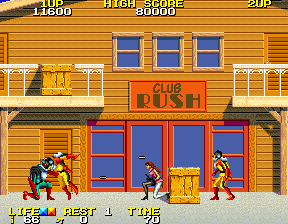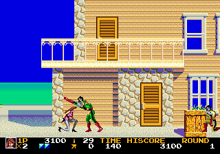 The core of the game hasn’t changed much, beyond the expanded scenery. The game is still very difficult, but the biggest concession is that you no longer take damage simply from bumping into an enemy. You will, of course, take a point of damage if they manage to punch you. In the early stages of the game, this greater defensive capability makes dealing with the floods of enemies a little easier. However, once the game introduces enemies that can fire while ducking, then the difficulty shoots way up. There are a couple of new enemies, like foes with glowing shields that can only be hit from the back, and bad guys that attack with bubbles.