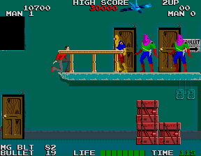 The most pronounced difference is that, in Rolling Thunder, you have limited ammunition. Running out of bullets doesn’t leave you completely defenseless, but you can only fire a single bullet at a time, which is extremely inefficient against the hordes of enemies you’ll be fighting off. In order to replenish your ammo supply, you need to duck in one of the many doors spread throughout the levels. Most are helpfully labeled, and a few even offer an upgraded machine gun, with more rapid fire power. There’s even a rather helpful bug, wherein ammo stores replenish their stock if you walk a couple of screens forward then double back. However, the time limit is often very tight, so this isn’t always abusable.