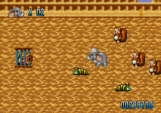 You play as Rolo, a young elephant who was captured by the cruel McSmiley’s Circus and forced to perform tricks. Luckily he’s been able to escape, but now he needs to make his way back home to his mom and rescue the various animals locked up in cages by McSmiley. You can run, dash and jump, as well as pick up glasses of water to shoot at enemies or vacuum cleaners to suck up objects by pressing C. To open the level exit, you’ll have to bonk the ringmaster carrying a key and use it to free all the caged animals.