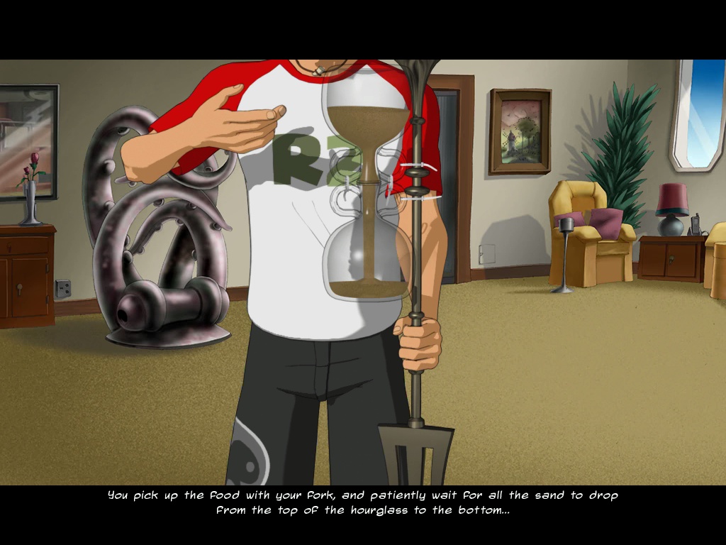 While the narrative sees some slight improvements, the rest of the game doesn’t. Brian still refuses to pick up stuff unless you’ve previously discovered a reason to, and the hotspots are still too difficult to find. The puzzles aren’t as overtly stupid as in the first game, but there are still some real headspinners. At one point, you need to get an item from one of Sushi’s stupid friends. He’s an inventor, and discusses how he wants to create a tool that makes people eat slower. (How odd.) To solve this, you need to empty a few wine jugs, fill them with sand, tie them together, and stick them on to a trident you nab from a statue. Thus, you have a large-scale model of a “time fork”, a fork with an hourglass attached to it. The game almost seems to acknowledge how dumb this is, but it’s still quite inane.