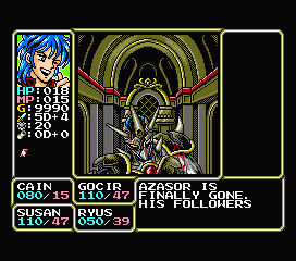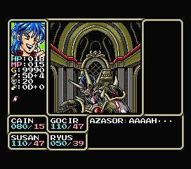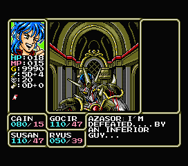 The main villain of this game, Azasort, is much more badass than the crazy pink frog faced in the first game. He looks like a cross between The Guyver, Mazinger-Z and Optimus Prime, and he’s tough as all hell. When you first reach him, you most likely won’t be strong enough yet and go back to town to upgrade your weapons.