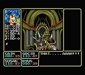 Azasort, along with all the playable knights, has lines of actual spoken dialogue, which is quite impressive for an MSX2 game. While all they say is “Yatta” or “Shi-ne”, it adds a lot to the atmosphere of the game, especially the last battle. The music is excellent too, from the heroic main theme to the desperate battle theme, it’s MSX awesomeness from beginning to end.