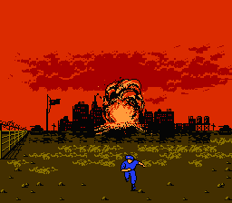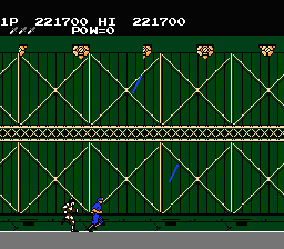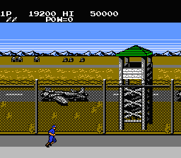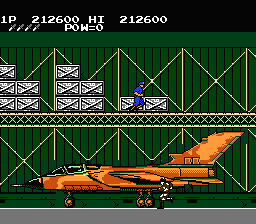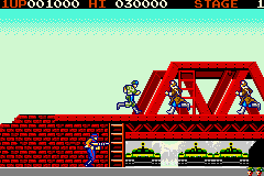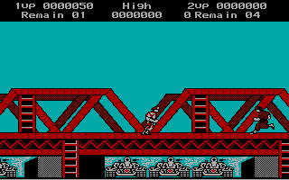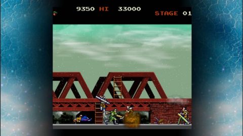 Each of the four stages has you simply make your way from one end of the stage to the other, with no vertical scrolling or even any walls in your way to slow you down. While there are ladders you can climb to reach higher platforms, the fact that enemies will simply follow you upwards means that they’re best use to avoid the occasional set of land mines you’ll come across. The rather barren level design means that your biggest concern is the constant deluge of enemy soldiers that come running towards you from either side of the screen. As you make your way through the base, however, you’ll soon have to deal with new types of foes, like paratroopers who shoot at you from the air, mortar operators who fire arcing projectiles, and martial artists that you’ll have to jump against to stop their deadly jump kick. You’ll also need to be ready for the final assault of enemies at the end of each stage, each of which often brings in a new type of foe to bring with, like swooping gyrocopters, or long range flamethrower wielders.