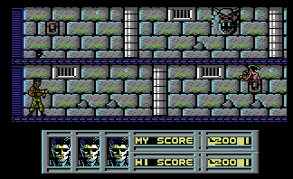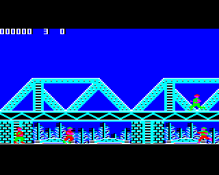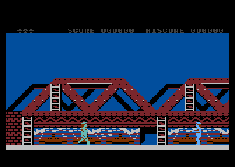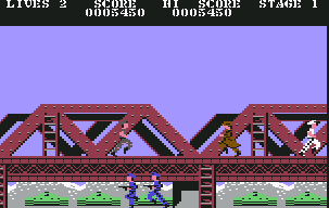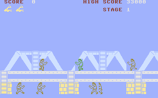 The Commodore 64 version could have been a decent port for its time, but it has a few issues that keep it from being worth playing. Enemies with firearms give you practically no time at all before they fire, which means you’ll rarely have the chance to crouch under the bullets they shoot. Since this port also spawns soldiers with guns way, way more often the regular grunts, this means that getting anywhere is a matter of luck, since any enemy can shoot you before you can react at just about any point. It’s actually far more difficult than the arcade version, which is a pretty impressive feat. Still, it has some nice exclusive music that plays on its loading and title screens from Martin Galloway, and that alone is worth a listen.