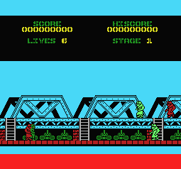Graphically, the game isn’t quite as impressive of some other games of the time, and its small, faceless character sprites pale a little in comparison with games like Ghosts N’ Goblins. The tradeoff is that it helps the game bring so many foes onto the screen at once without slowing the game down, which is what helps the experience stay so tense. At the very least, each of the stages are pretty distinct, with their own unique backgrounds, like the massive missiles that you’ll run past in the game’s first stage. The main theme, a looping drum cadence, is appropriate enough for the theme, if not particularly memorable, something that could be said for the rest of the game’s various jingles.