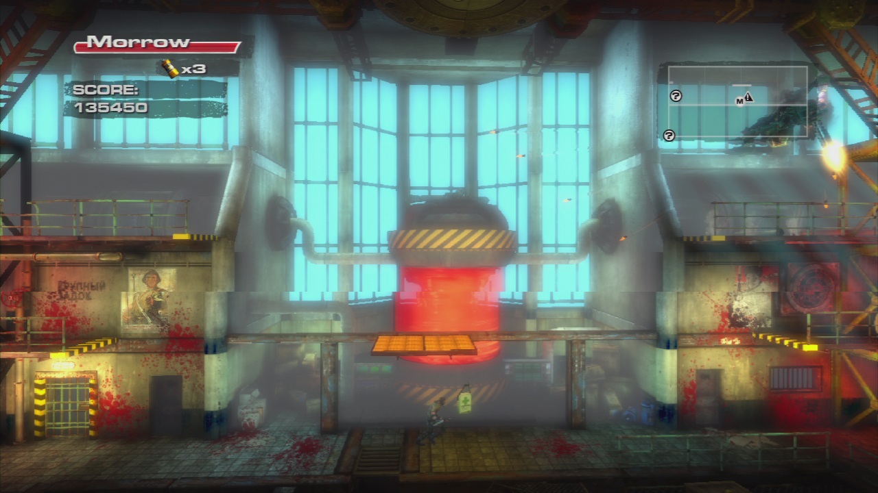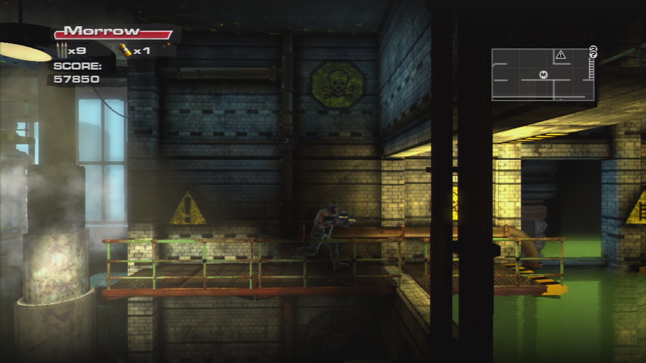 The original Rush ‘n Attack began with your hero completely botching their infiltration attempt and calling everyone on the base right to his position. Ex-Patriot is even worse, because the game starts with Morrow getting captured and tossed into a prison. Accordingly, the first thing you need to do is break out. This initial section of the game mostly closely resembles, weirdly enough, Epic Games’ Shadow Complex, in that it’s a somewhat open-ended 2.5D side-scroller focused on stealth. You’re only equipped with a knife here, which is a little awkward to use. (Bad guys aren’t immediately killed by a single stab anymore.) Instead, you’re supposed to sneak up behind them and slit their throats, or climb up from beneath enemies and throw them over ledges. Your map screen indicates your current goal, whether it to be to find keys to toss switches to lower water levels or turn off electricity. There are tons of air ducts and other areas to crawl into, many hiding various items, like health packs, which you can collect to use at any time, or Ulyssium crystals, which can expand your health. A few extra items can be found, too, like night vision goggles, or gas masks, to get through poisonous areas. You’ll also learn new knife combos as you progress throughout the game.