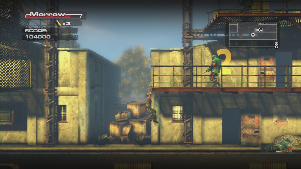 However, there’s still a fundamental problem with Ex-Patriot: the original game was an incredibly difficult experience, but was only about 15 minutes from start to completion. This one is much, much easier, with a life bar, numerous health restoratives, and constant checkpoints, but takes place over three levels, each about an hour long. Although there are some enjoyable aspects, in general it’s just too easy and repetitive to be much fun. The story is terrible and the main character isn’t all that interesting, either – compared to his predecessor’s green beret, his only distinguishing trait is his face mask. It’s also fairly messy from a technical perspective, with a choppy frame rate and spongy controls. Compared to the crisp, smooth motion of GRIN’s Bionic Commando: Rearmed, its closest visual point of comparison, it looks and runs terribly. There’s also almost no music either, with most of the game just consisting of sound effects.